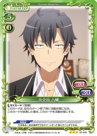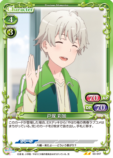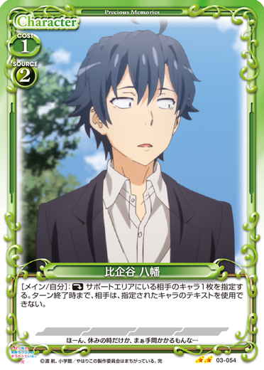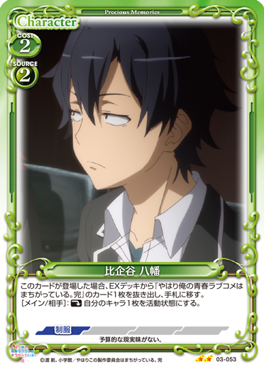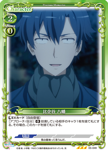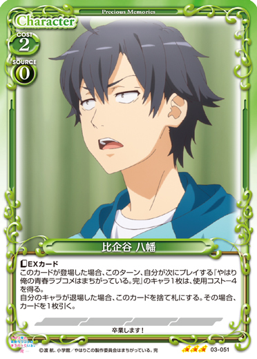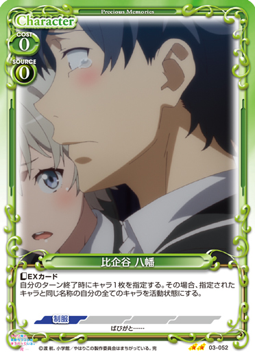 | 〔EXカード〕このカードが登場した場合、このターン、自分が次にプレイする『やはり俺の青春ラブコメはまちがっている。完』のキャラ1枚は、使用コスト-4を得る。自分のキャラが退場した場合、このカードを捨て札にする。その場合、カードを1枚引く。 | ||
