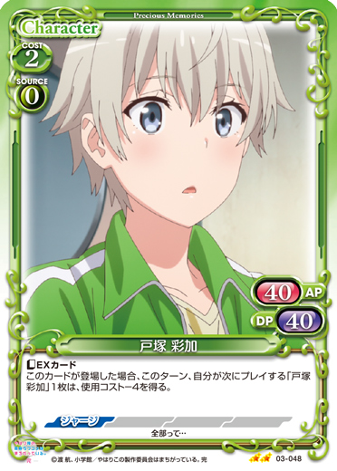 | 〔EXカード〕このカードが登場した場合、このターン、自分が次にプレイする「戸塚 彩加」1枚は、使用コスト-4を得る。 | ||