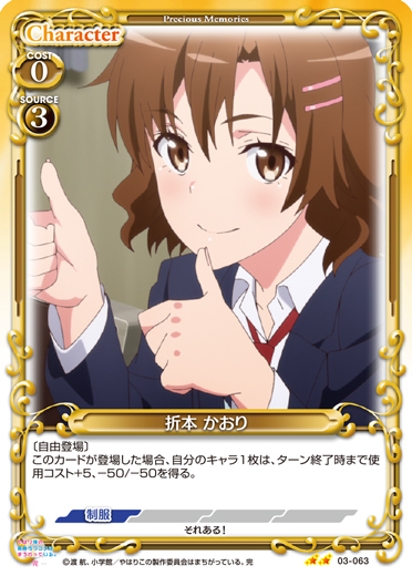 | 〔自由登場〕このカードが登場した場合、自分のキャラ1枚は、ターン終了時まで使用コスト+5、-50/-50を得る。 | ||
