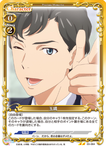 | 〔自由登場〕このカードが登場した場合、自分のキャラ1枚を指定する。このターン、そのキャラが退場した場合、自分と相手のポイント置き場にある全てのカードを裏向きにする。 | ||
