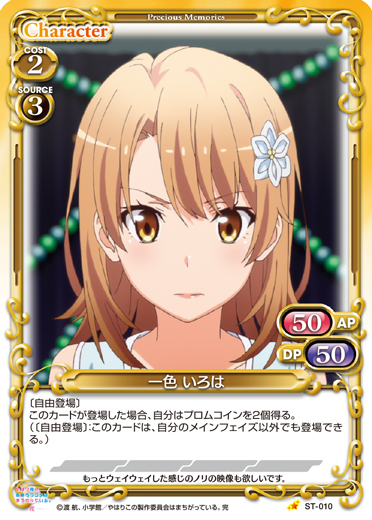 | 〔自由登場〕このカードが登場した場合、自分はプロムコインを2個得る。(〔自由登場〕:このカードは、自分のメインフェイズ以外でも登場できる。) | ||