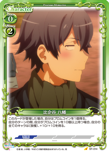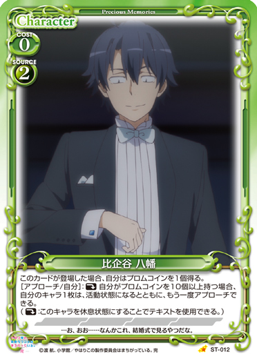 | このカードが登場した場合、自分はプロムコインを1個得る。その場合、デッキの中を全て見て、その中にあるAP/DPが0/0のキャラ1枚を抜き出し、表にしてから手札に移す。その後、デッキをシャッフルする。 | ||