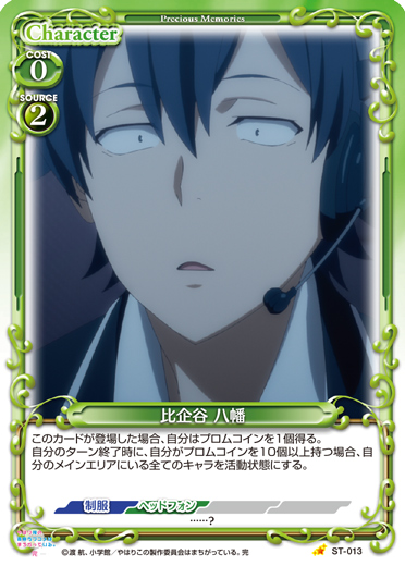 | このカードが登場した場合、自分はプロムコインを1個得る。自分のターン終了時に、自分がプロムコインを10個以上持つ場合、自分のメインエリアにいる全てのキャラを活動状態にする。 | ||