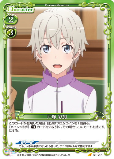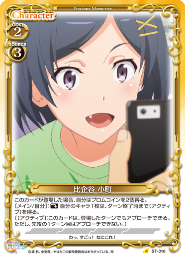 | このカードが登場した場合、自分はプロムコインを2個得る。[メイン/自分]:《休》自分のキャラ1枚は、ターン終了時まで〔アクティブ〕を得る。(〔アクティブ〕:このカードは、登場したターンでもアプローチできる。ただし、先攻の1ターン目はアプローチできない。) | ||