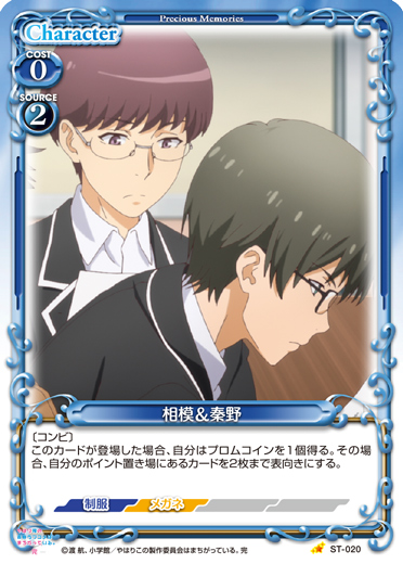 | 〔コンビ〕このカードが登場した場合、自分はプロムコインを1個得る。その場合、自分のポイント置き場にあるカードを2枚まで表向きにする。 | ||