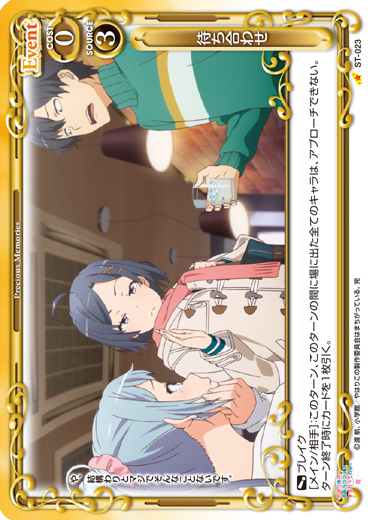 | 〔ブレイク〕[メイン/相手]:このターン、このターンの間に場に出た全てのキャラは、アプローチできない。ターン終了時にカードを1枚引く。 | ||