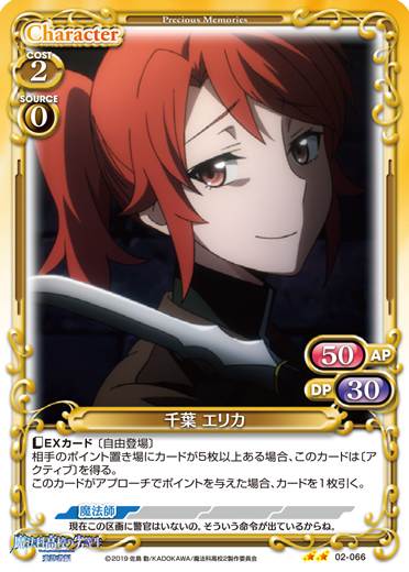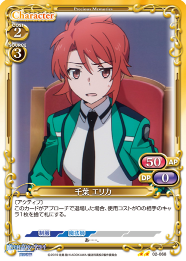 | 〔アクティブ〕このカードがアプローチで退場した場合、使用コストが0の相手のキャラ1枚を捨て札にする。 | ||