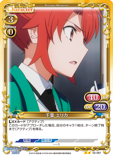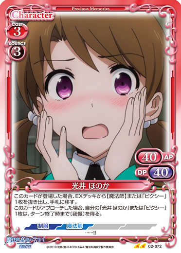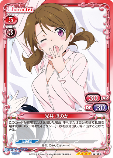 | このカードが登場した場合、EXデッキから【魔法師】または「ピクシー」1枚を抜き出し、手札に移す。このカードがアプローチした場合、自分の「光井 ほのか」または「ピクシー」1枚は、ターン終了時まで〔我慢〕を得る。 | ||