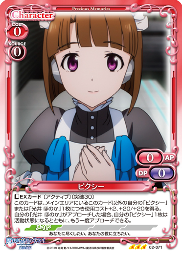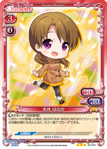 | 〔EXカード〕〔アクティブ〕〔突破30〕このカードは、メインエリアにいるこのカード以外の自分の「ピクシー」または「光井 ほのか」1枚につき使用コスト+2、+20/+20を得る。自分の「光井 ほのか」がアプローチした場合、自分の「ピクシー」1枚は活動状態になるとともに、もう一度アプローチできる。 | ||