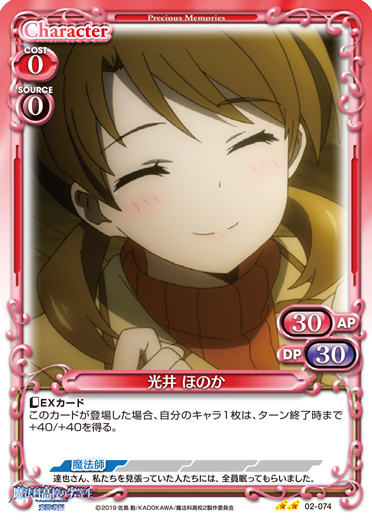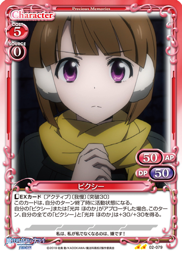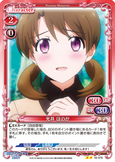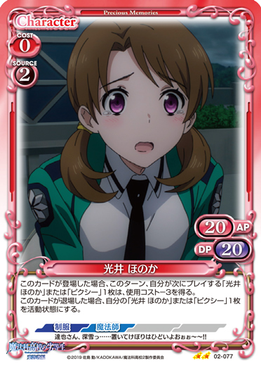 | このカードが登場した場合、このターン、自分が次にプレイする「光井 ほのか」または「ピクシー」1枚は、使用コスト-3を得る。このカードが退場した場合、自分の「光井 ほのか」または「ピクシー」1枚を活動状態にする。 | ||