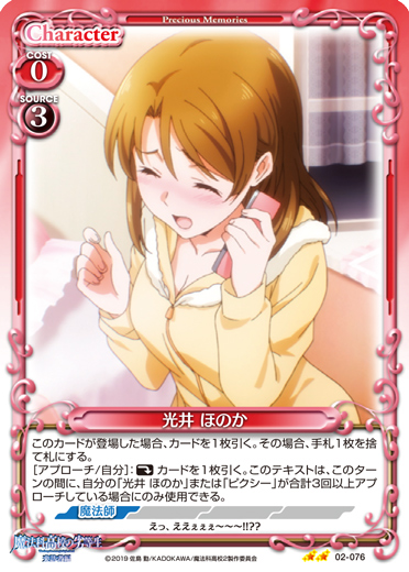 | このカードが登場した場合、カードを1枚引く。その場合、手札1枚を捨て札にする。[アプローチ/自分]:《休》カードを1枚引く。このテキストは、このターンの間に、自分の「光井 ほのか」または「ピクシー」が合計3回以上アプローチしている場合にのみ使用できる。 | ||