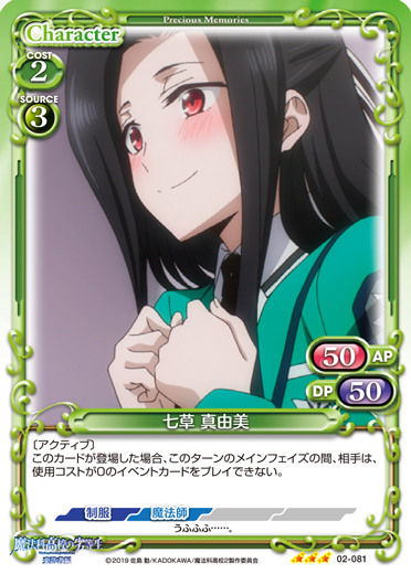 | 〔アクティブ〕このカードが登場した場合、このターンのメインフェイズの間、相手は、使用コストが0のイベントカードをプレイできない。 | ||