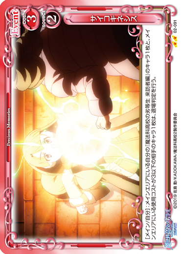 | [メイン/自分]:メインエリアにいる自分の『魔法科高校の劣等生 来訪者編』のキャラ1枚と、メインエリアにいる使用コストが3以下の相手のキャラ1枚は、退場判定を行う。 | ||