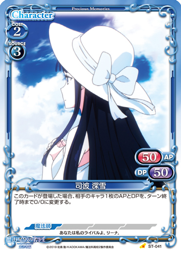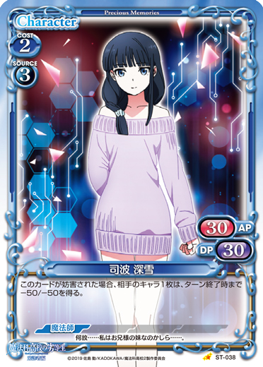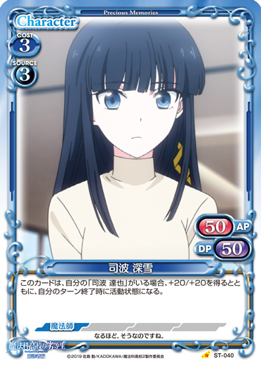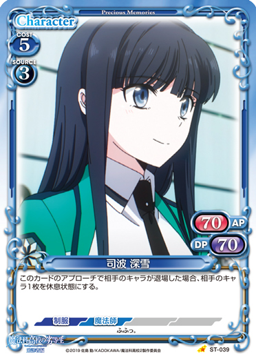 | このカードは、自分の「司波 達也」がいる場合、+20/+20を得るとともに、自分のターン終了時に活動状態になる。 | ||