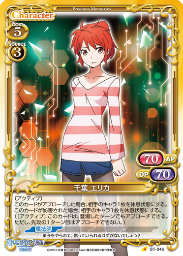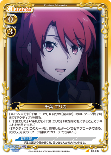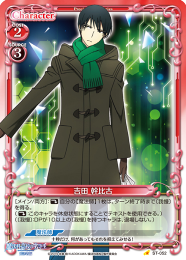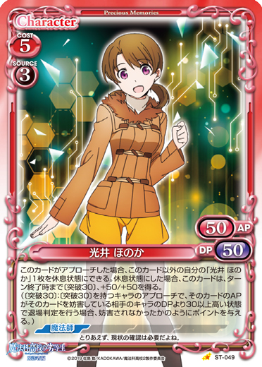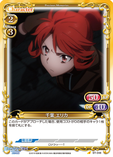 | [メイン/両方]:《休》自分の【魔法師】1枚は、ターン終了時まで〔我慢〕を得る。(《休》:このキャラを休息状態にすることでテキストを使用できる。)(〔我慢〕:DPが10以上の〔我慢〕を持つキャラは、退場しない。) | ||