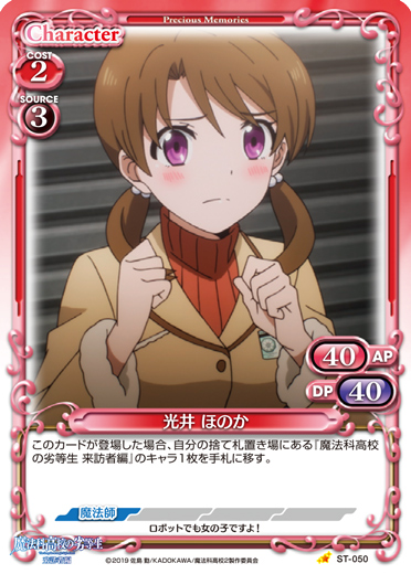 | このカードが登場した場合、自分の捨て札置き場にある『魔法科高校の劣等生 来訪者編』のキャラ1枚を手札に移す。 | ||