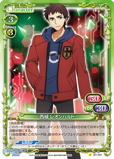 | 〔自由登場〕このカードが退場した場合、メインエリアにいる自分の全てのキャラを活動状態にする。(〔自由登場〕:このカードは、自分のメインフェイズ以外でも登場できる。) | ||