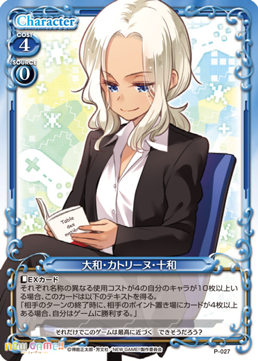 | 〔EXカード〕それぞれ名称の異なる使用コストが4の自分のキャラが10枚以上いる場合、このカードは以下のテキストを得る。「相手のターンの終了時に、相手のポイント置き場にカードが4枚以上ある場合、自分はゲームに勝利する。」 | ||