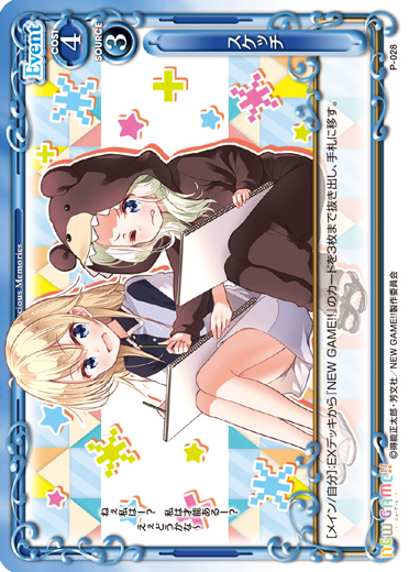 | [メイン/自分]:EXデッキから『NEW GAME!!』のカードを3枚まで抜き出し、手札に移す。 | ||