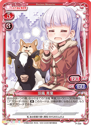 | 自分のターンの間、自分の全ての「涼風 青葉」は+30/+30を得る。[アプローチ/自分]:《0》このカードは、活動状態になるとともに、もう一度アプローチできる。 | ||