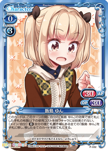 | このカードは、このターンの間に自分の「飯島 ゆん」の効果で捨て札にした手札の枚数以下の使用コストを持つキャラには妨害されない。[メイン/自分]:《0》自分の捨て札置き場にある全ての「飯島 ゆん」を手札に移し、移した全てのカードを捨て札にする。 | ||