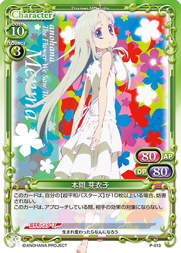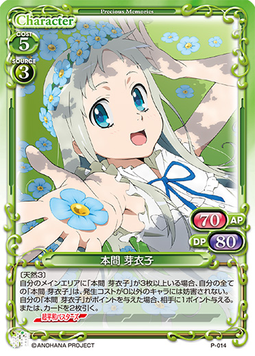 | 〔天然3〕自分のメインエリアに「本間 芽衣子」が3枚以上いる場合、自分の全ての「本間 芽衣子」は、発生コストが0以外のキャラには妨害されない。自分の「本間 芽衣子」がポイントを与えた場合、相手に1ポイント与える。または、カードを2枚引く。 | ||