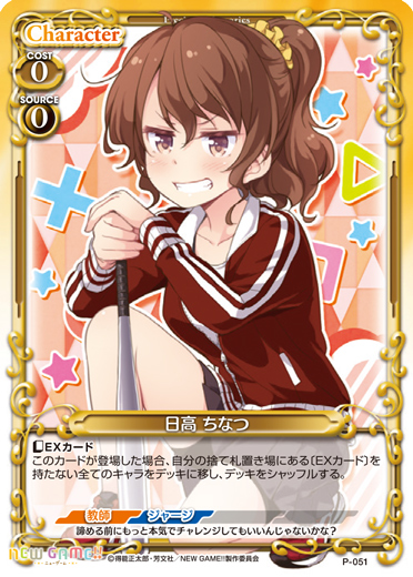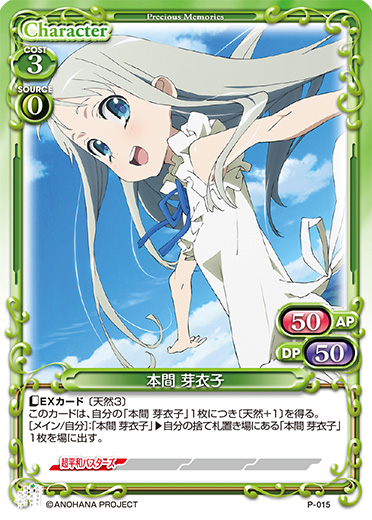 | 〔EXカード〕〔天然3〕このカードは、自分の「本間 芽衣子」1枚につき〔天然+1〕を得る。[メイン/自分]:「本間 芽衣子」▶自分の捨て札置き場にある「本間 芽衣子」1枚を場に出す。 | ||