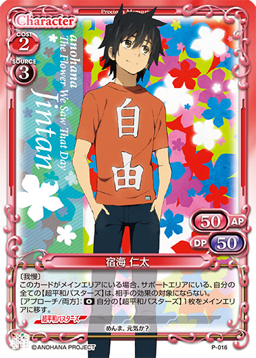 | 〔我慢〕このカードがメインエリアにいる場合、サポートエリアにいる、自分の全ての【超平和バスターズ】は、相手の効果の対象にならない。[アプローチ/両方]:《0》自分の【超平和バスターズ】1枚をメインエリアに移す。 | ||