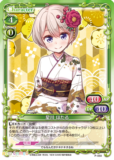 | 〔EXカード〕〔我慢〕それぞれ名称の異なる使用コストが4の自分のキャラが10枚以上いる場合、このカードは以下のテキストを得る。「このカードがアプローチした場合、カードを4枚引く。」 | ||