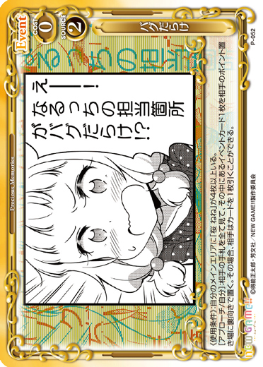 | 《使用条件》:自分のメインエリアに「桜 ねね」が4枚以上いる。[アプローチ/自分]:相手の手札を全て見て、その中にあるイベントカード1枚を相手のポイント置き場に裏向きで置く。その場合、相手はカードを1枚引くことができる。 | ||
