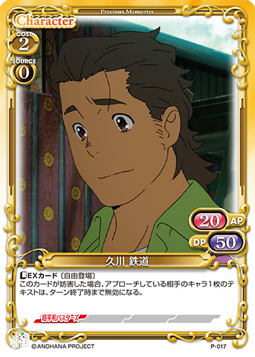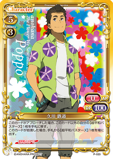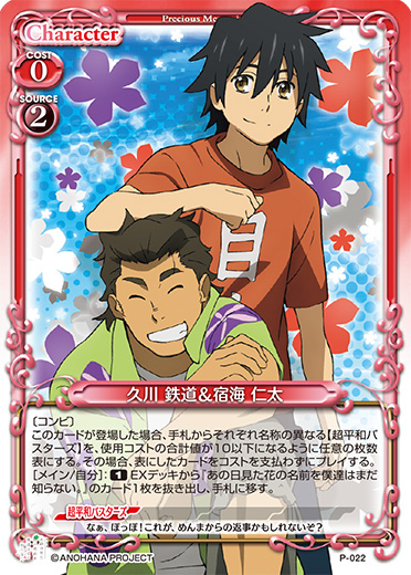 | このカードは、自分の【超平和バスターズ】が10枚以上いる場合、アプローチで与えるポイントが2点になる。このカードは、アプローチした場合、活動状態になるとともに、もう一度アプローチできる。 | ||