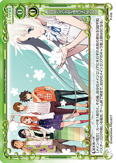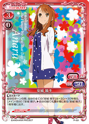 | 〔EXカード〕自分のターンの間、自分の全ての「安城 鳴子」は+30/+30を得る。[メイン/自分]:「安城 鳴子」▶自分の捨て札置き場にある「安城 鳴子」1枚を場に出す。 | ||