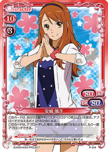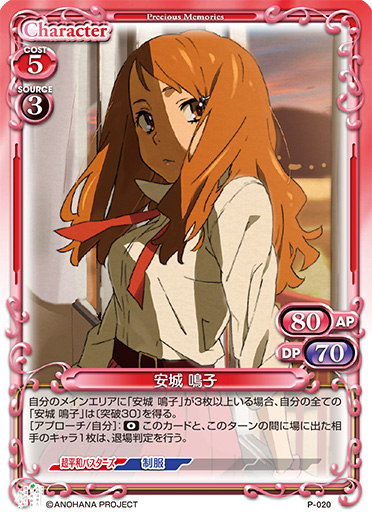| 自分のメインエリアに「安城 鳴子」が3枚以上いる場合、自分の全ての「安城 鳴子」は〔突破30〕を得る。[アプローチ/自分]:《0》このカードと、このターンの間に場に出た相手のキャラ1枚は、退場判定を行う。 | ||