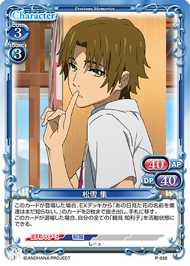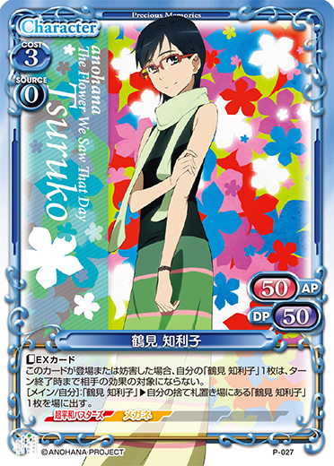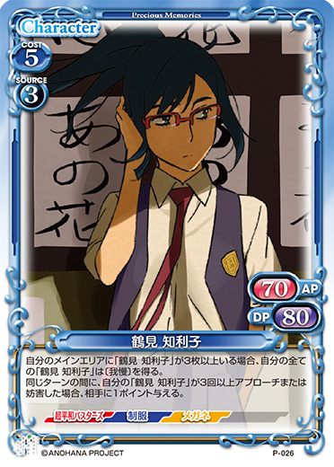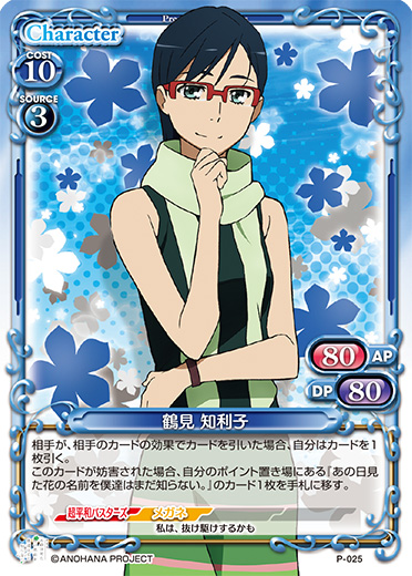 | このカードが登場した場合、EXデッキから『あの日見た花の名前を僕達はまだ知らない。』のカードを2枚まで抜き出し、手札に移す。このカードが退場した場合、自分の全ての「鶴見 知利子」を活動状態にできる。 | ||