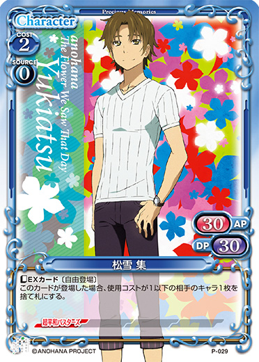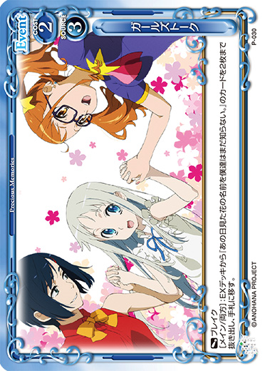 | 相手が、相手のカードの効果でカードを引いた場合、自分はカードを1枚引く。このカードが妨害された場合、自分のポイント置き場にある『あの日見た花の名前を僕達はまだ知らない。』のカード1枚を手札に移す。 | ||