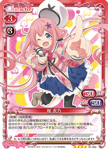 | 〔我慢〕〔自由登場〕自分の手札の上限枚数は5枚になる。自分のターンの間、自分の全ての「桜 衣乃」は+30/+30を得る。自分の「桜 衣乃」がアプローチするごとに、カードを1枚引く。 | ||