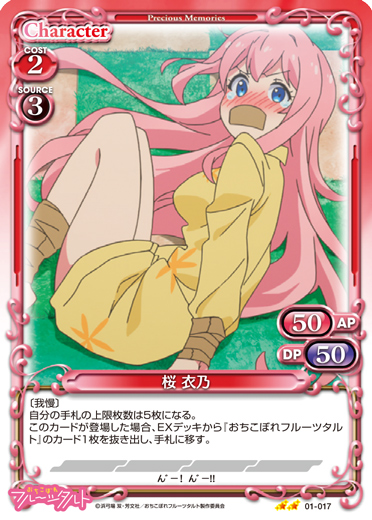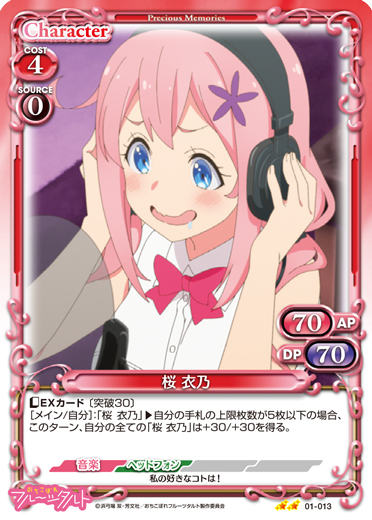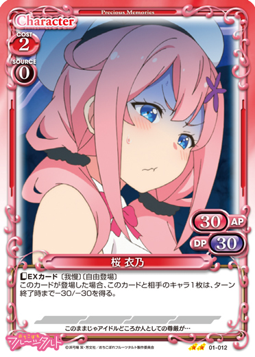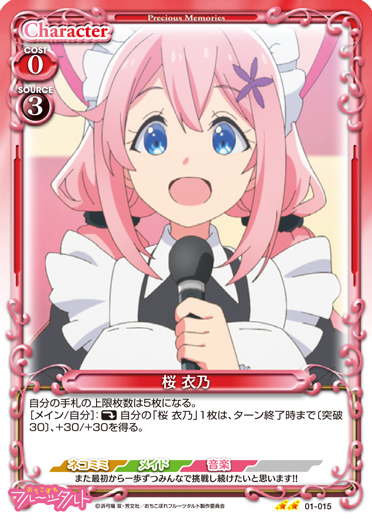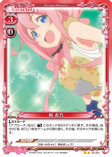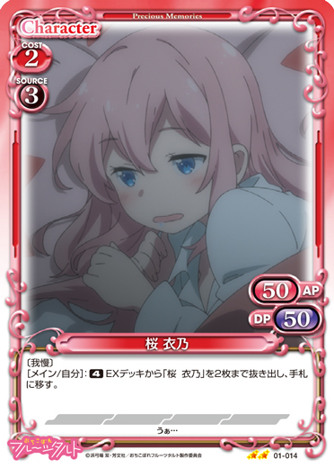 | 〔EXカード〕[アプローチ/自分]:《休》このカードをEXデッキに移す。その場合、自分の「桜 衣乃」1枚をゲームから取り除く。その後、そのキャラを場に出す。 | ||