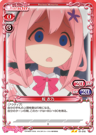 | 自分の手札の上限枚数は5枚になる。[メイン/自分]:《休》自分の「桜 衣乃」1枚は、ターン終了時まで〔突破30〕、+30/+30を得る。 | ||