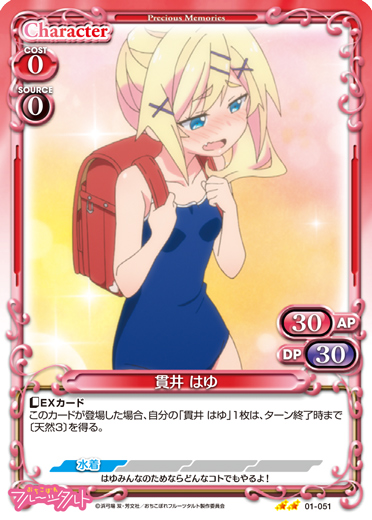 | 〔EXカード〕このカードが登場した場合、自分の「貫井 はゆ」1枚は、ターン終了時まで〔天然3〕を得る。 | ||