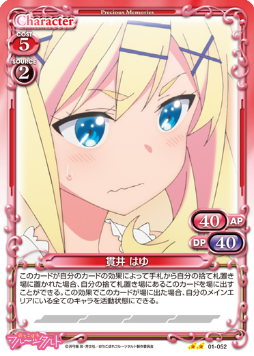 | 〔自由登場〕このカードがアプローチした場合、自分の捨て札置き場にあるキャラ1枚を手札に移す。「前原 仁菜」がデッキから自分の捨て札置き場に置かれた場合、このカードは、ターン終了時まで妨害されない。 | ||