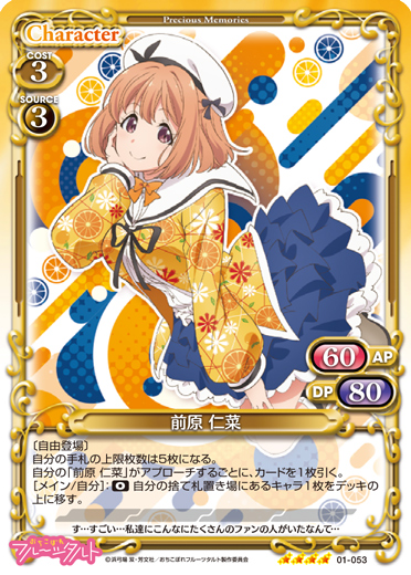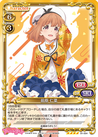 | 〔自由登場〕自分の手札の上限枚数は5枚になる。自分の「前原 仁菜」がアプローチするごとに、カードを1枚引く。[メイン/自分]:《0》自分の捨て札置き場にあるキャラ1枚をデッキの上に移す。 | ||