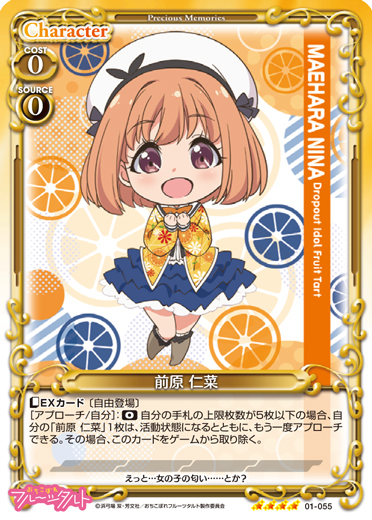 | このカードは、相手のメインフェイズにも登場できる。このカードが登場した場合、自分の捨て札置き場にある「前原 仁菜」1枚をメインエリアに出す。[アプローチ/相手]:「前原 仁菜」▸カードを1枚引く。その場合、このカードを捨て札にする。 | ||