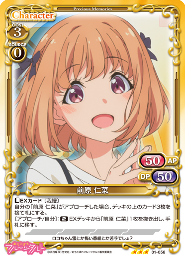 | 〔EXカード〕〔我慢〕自分の「前原 仁菜」がアプローチした場合、デッキの上のカード3枚を捨て札にする。[アプローチ/自分]:《2》EXデッキから「前原 仁菜」1枚を抜き出し、手札に移す。 | ||