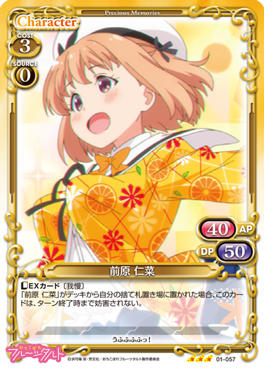 | 〔EXカード〕〔我慢〕「前原 仁菜」がデッキから自分の捨て札置き場に置かれた場合、このカードは、ターン終了時まで妨害されない。 | ||