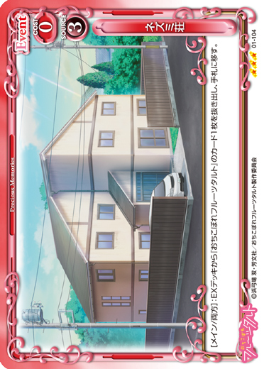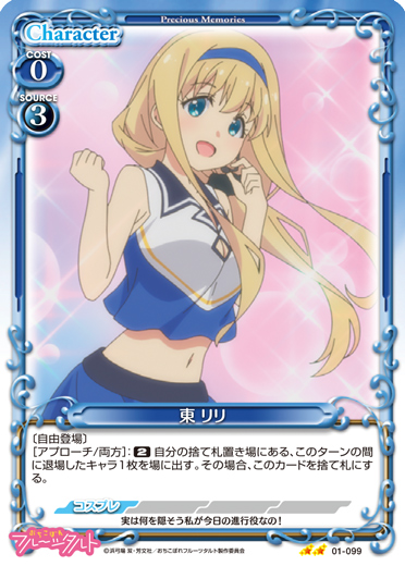 | 〔自由登場〕[アプローチ/両方]:《2》自分の捨て札置き場にある、このターンの間に退場したキャラ1枚を場に出す。その場合、このカードを捨て札にする。 | ||