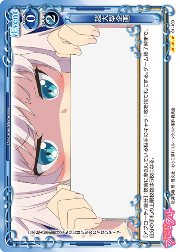 | [アプローチ/自分]:妨害に参加している相手のキャラ1枚を捨て札にする。ゲーム終了時まで、自分の手札の上限枚数は5枚になる。 | ||