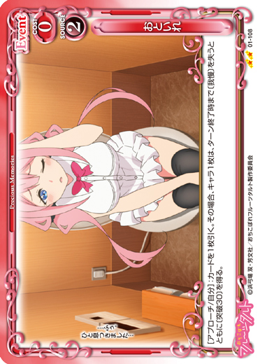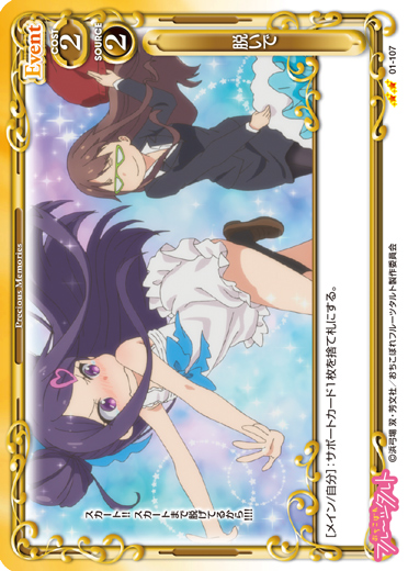 | 〔我慢〕このカードが妨害された場合、自分のポイント置き場にある【制服】1枚を手札に移すことができる。(〔我慢〕:DPが10以上の〔我慢〕を持つキャラは、退場しない。) | ||
