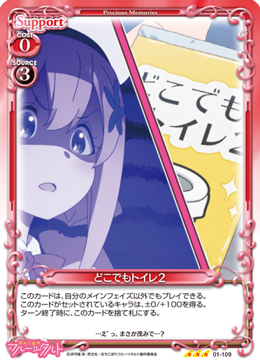 | このカードは、自分のメインフェイズ以外でもプレイできる。このカードがセットされているキャラは、±0/+100を得る。ターン終了時に、このカードを捨て札にする。 | ||