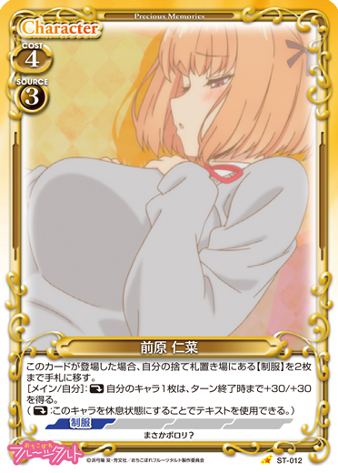 | このカードが登場した場合、自分の捨て札置き場にある【制服】を2枚まで手札に移す。[メイン/自分]:《休》自分のキャラ1枚は、ターン終了時まで+30/+30を得る。(《休》:このキャラを休息状態にすることでテキストを使用できる。) | ||