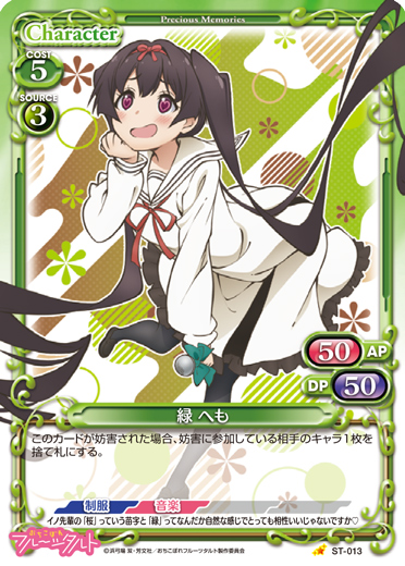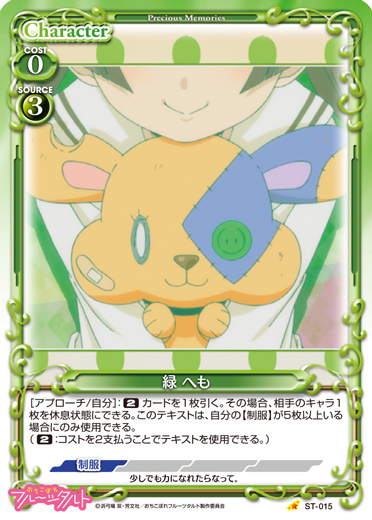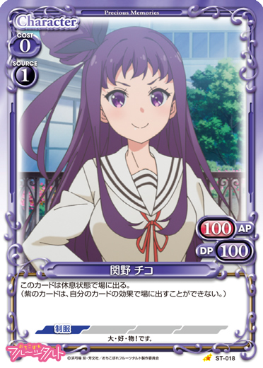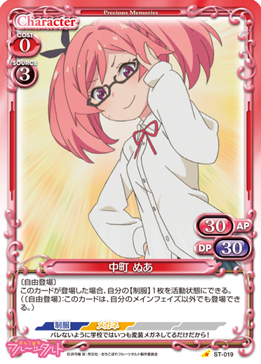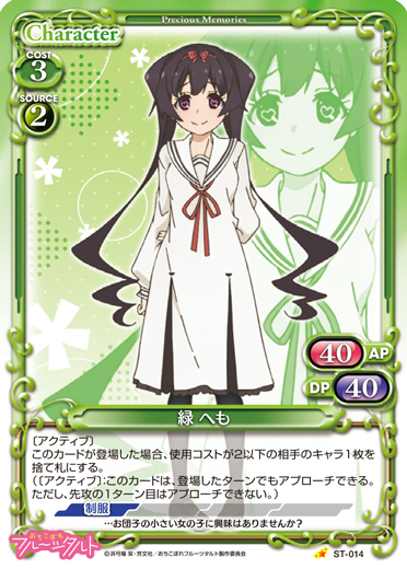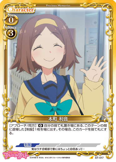 | 〔自由登場〕このカードが登場した場合、自分の【制服】1枚を活動状態にできる。(〔自由登場〕:このカードは、自分のメインフェイズ以外でも登場できる。) | ||